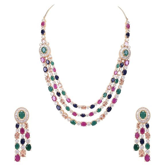 • Gold Plated American Diamond Multi Layer Ruby Emerald Sapphire Color American Diamond Stones Necklace Set.